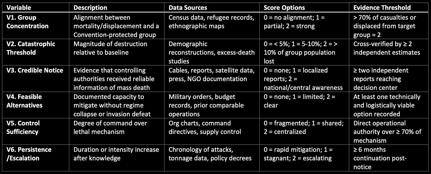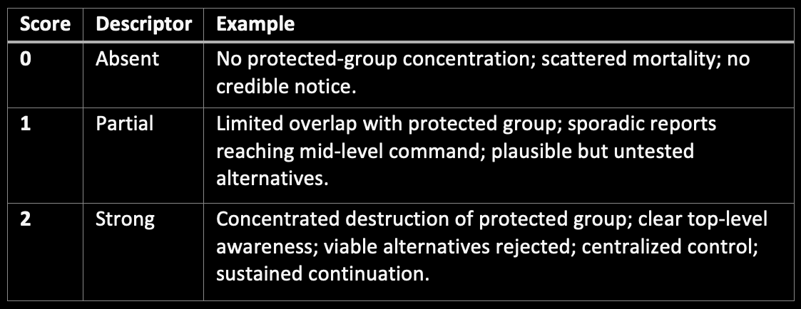 When these six conditions converge, a presumption of genocidal intent arises. To rebut it, a state must demonstrate genuine lack of knowledge, impossibility of alternative action, or loss of command. Absent such evidence, persistence under knowledge is the empirical form of will.