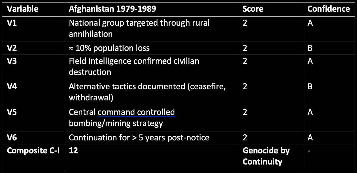 Afghanistan meets each condition. The population destroyed was national, the deaths exceeded ten percent, field reports confirmed the annihilation early in the war, operational alternatives existed, command was centralized, and the campaign persisted for a decade. By continuity-as-intent, this is genocide. The absence of confession is irrelevant; the archive of persistence is sufficient.