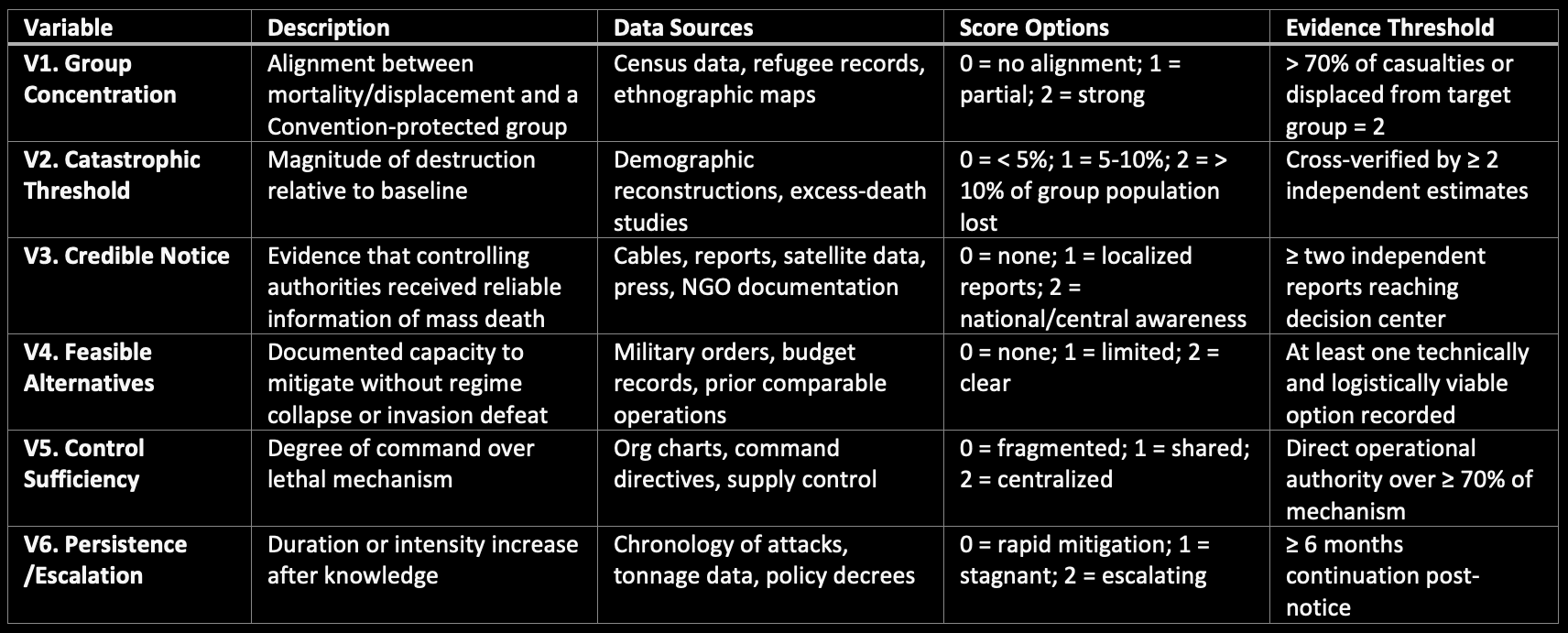 Continuity-as-intent becomes actionable only when a specific configuration of evidence exists. Genocide is a system crime, and its proof must therefore mirror the system’s architecture. Six conditions define the evidentiary convergence: concentration, magnitude, notice, alternatives, control, and persistence. They are measurable variables that together describe the transition from atrocity to genocide.